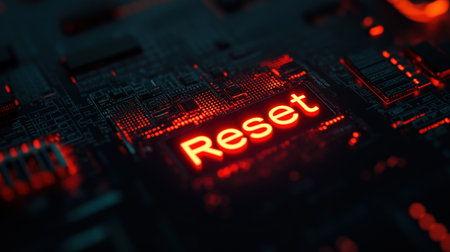 Reset button glowing in red light on a futuristic circuit board. Technology reboot concept.