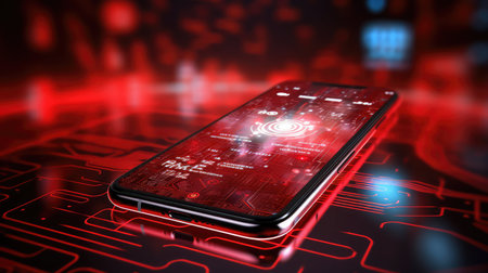 Stunning visual of a smartphone resting on a circuit board, illuminated with vibrant neon elements, representing the fusion of technology and design in the digital age.