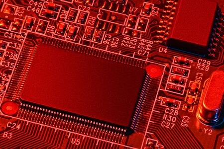 printed circuit board and microchip, or cpu, in red light closeup - electronic component for digital equipment, concept for development of electric computer circuits