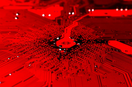 Close up macro of electronic chip in red and black colors. Background texture with copy space. Computer elements, abstract motherboard. Connection, technology and internet concept