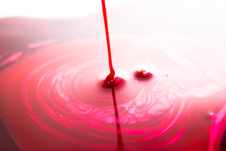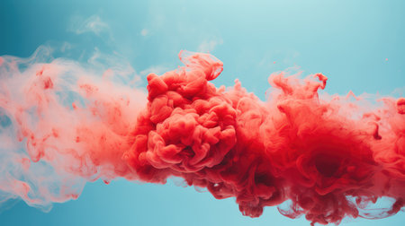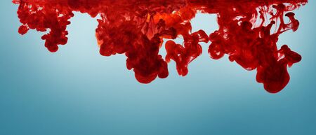 Abstract color paint splash on blue background. Red ink in water. Modern design with motion liquid dye.