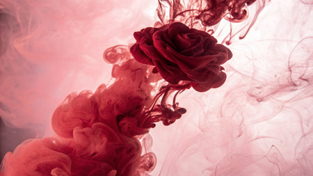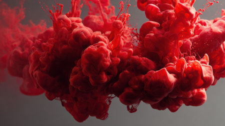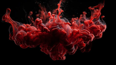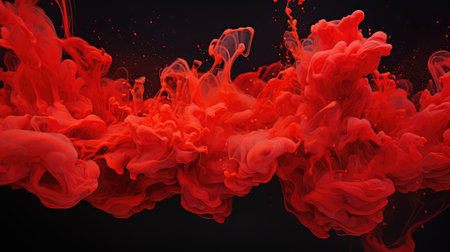 A captivating image showcases a dynamic burst of red ink against a stark black background. The ink appears to be in motion, creating an abstract, flower-like pattern with delicate petals and swirls. The contrast between the vivid red and the dark backdrop enhances the visual impact, making the image both mesmerizing and artistic.