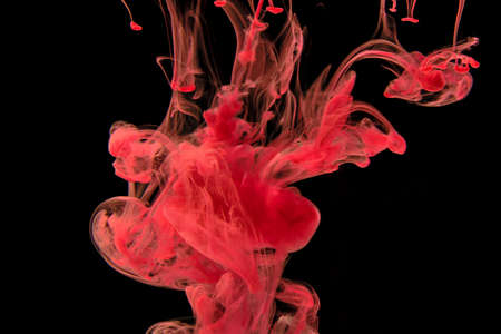 Abstract black alcrylic ink in water on red background.Fantasy chaotic colorful fractal pattern.