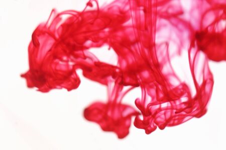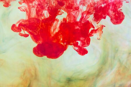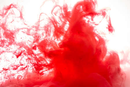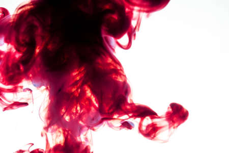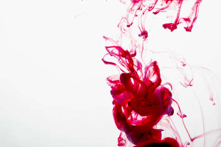 Beautiful abstract background. Drops of red ink in water. Red watercolor ink in water on a white background. Colored acrylic paints in water. Blood-red cloud of ink on a white background.