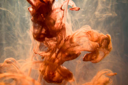 Dye cloud. Defocused stream. Gray black orange pigment smoke mix floating substance. Color fluid fume ink flow abstract contrast background.