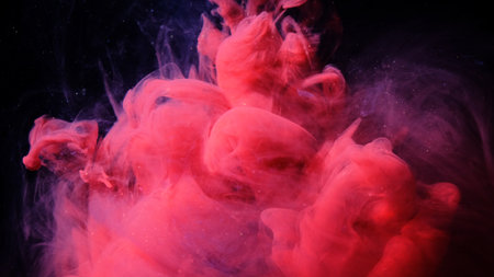 Ink water. Fog wave. Defocused pink red crimson color liquid particles chemical smoke acrylic substance twirling on abstract background.