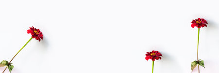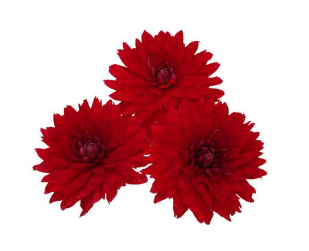 Red big chrysanthemum on white flat background. Banner shape.