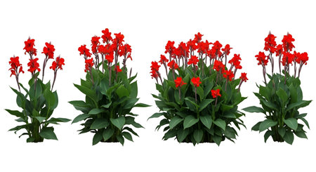 Four canna lily plants are showcased against a black background. Each plant displays abundant, large green leaves and numerous bright red flowers in clusters at the top. The plants are presented in varying sizes and densities.