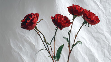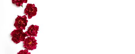 Creative layout made of red peony flowers on a white background. Top view, copy space for text for banner, poster, website.