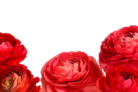 Beautiful fresh ranunculus flowers on white background, closeup