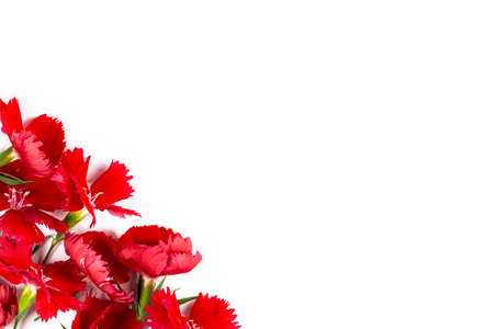 Frame made of red carnation flowers on white, place for text top view, copy space.