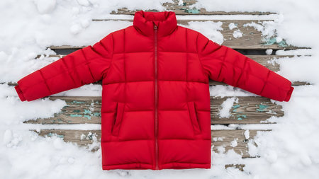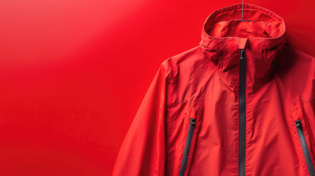 A vibrant red jacket displayed against a bold red background, showcasing modern design and stylish appeal, perfect for outdoor adventures or casual wear.
