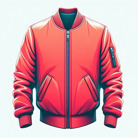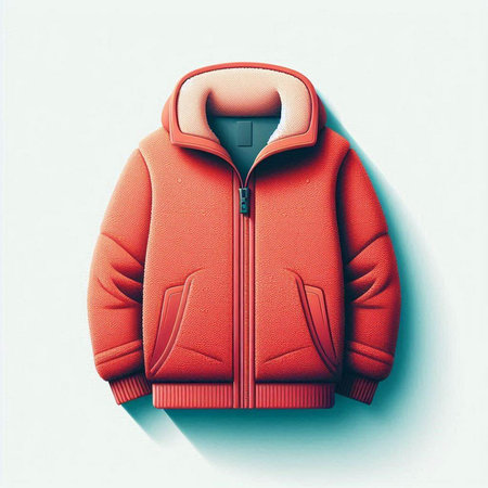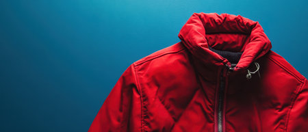 A vibrant red jacket is showcased highlighting its texture and design against a contrasting blue backdrop emphasizing its style and color.
