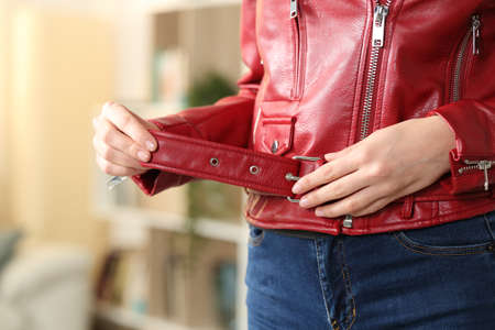 Close up of woman dressing hand fastening belt of red jacket standing at home