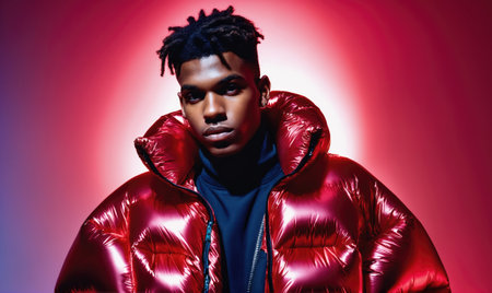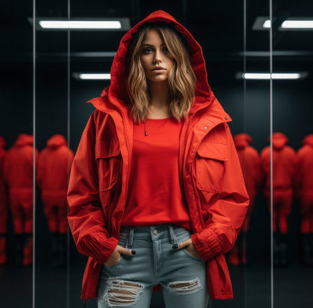 A vibrant red jacket is shown on a person highlighting its design and color against a neutral background.