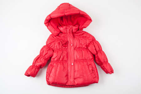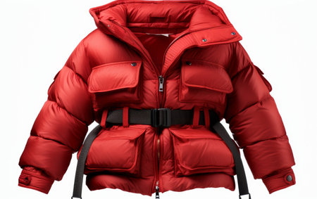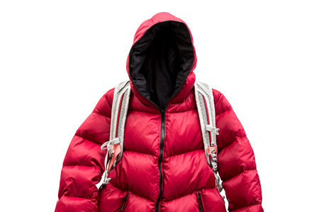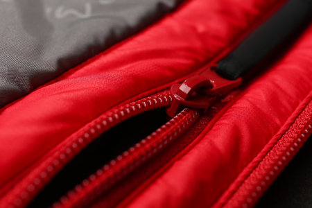 Close up of red jacket zipper , winter fashion outfit. Jacket isolated on white background.