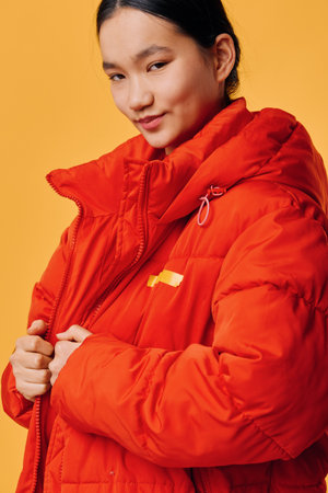 Young woman wearing bright orange puffer jacket against yellow background, portrait with playful expression. Casual winter clothing, warm outerwear and confident pose in studio