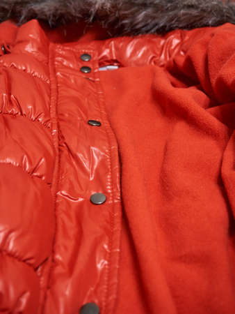 Red jacket with close-up rivets. Soft selective selective focus. Detail of clothes.
