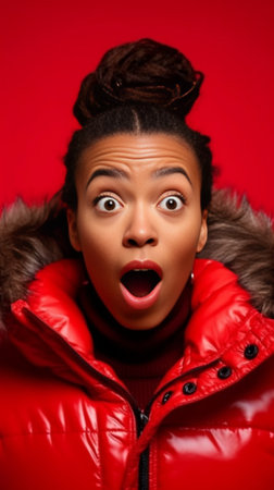 Woman in red puffer jacket and sweater posing against orange background. Portrait of young female with black hair in warm casual winter clothing, standing indoors in studio setting.