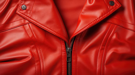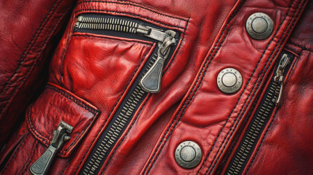 This close-up image showcases a detailed section of a red leather jacket. Highlighting the unique zippers and buttons, it represents modern fashion and craftsmanship.