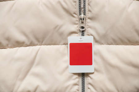 white tag for the price hangs on the zipper of a light jacket, the price tag on the clothes