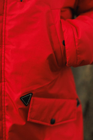 closeup of bright winter parka pocket, texture and color highlight playful outdoor fashion statement