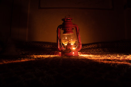 Bright light of an antique red oil lantern in the complete darkness