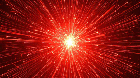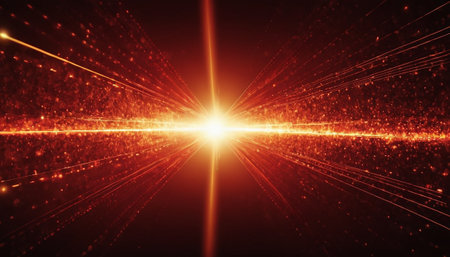 This image captures a mesmerizing burst of light emanating from a central point, creating a stunning array of red and orange beams that radiate outward. The beams are sharply defined against a dark background, creating a dramatic contrast that highlights the intensity and beauty of the light. The pattern suggests a sense of energy and dynamism, evoking feelings of warmth and vitality.
