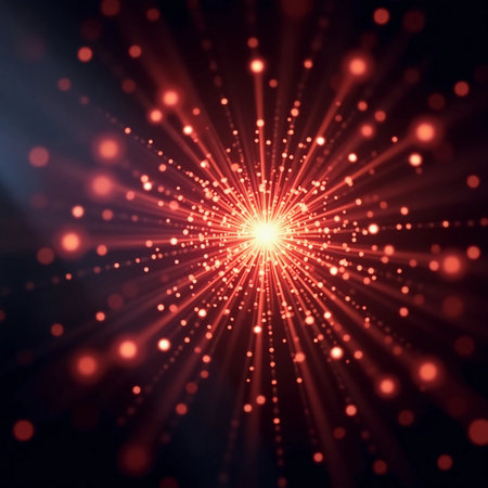 Dazzling particles erupt in a vibrant show, radiating vivid red and orange hues that create a captivating cosmic atmosphere full of energy and movement.