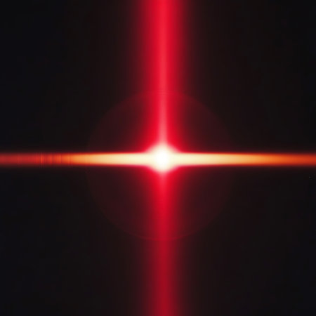 A bright red light source emits beams that form a distinct cross shape against a dark background. The central point is intensely bright, with softer red glows emanating outwards along the horizontal and vertical axes. This abstract image suggests energy and precision.