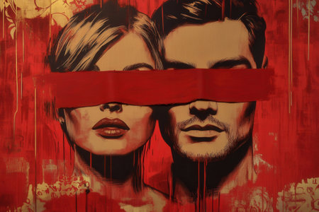 Forbidden love, couple with covered eyes expressing passion and mystery