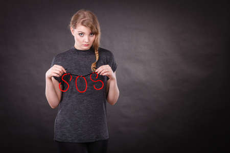 Sadness and depression concept. Young sad unhappy blonde woman with big red sos word. Girl in troubles needs help.