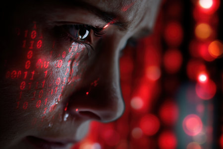 Close-up of a person's face with binary code projected on skin, tears visible, and dramatic red bokeh effect in the background, creating a cybernetic atmosphere