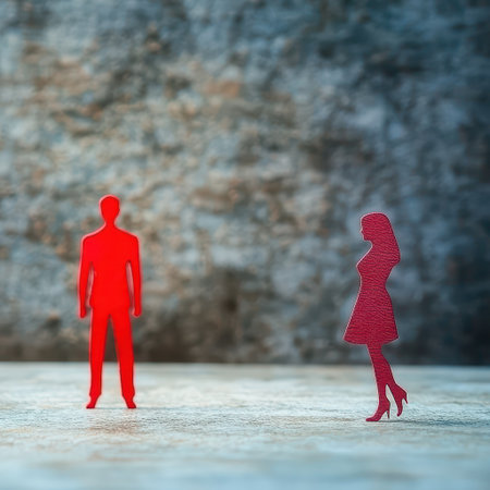 Two red figures stand on a textured surface suggesting a dialogue or connection between them in an artistic interpretation.