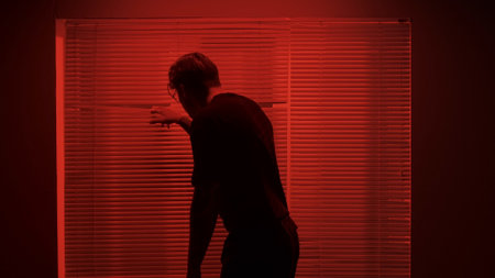 Portrait of male in dark room. Handsome man near window, red neon light shines behind jalousie, guy staring outside opens blinds with hand.