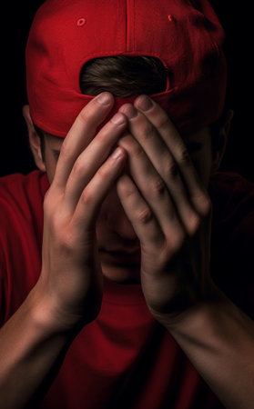 A woman with her hands covering her face in red. The woman is looking away from the camera