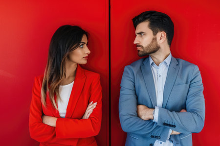 A woman in a red blazer and a man in a blue blazer stand with their arms crossed, facing each other against a red wall.