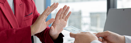 A man businessman in a suit refuses of money that is held in the hands of a person offering a bribe. Concept of bribery and corruption