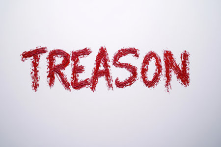 The word treason is written in bold red lipstick on a plain white background. The rough texture of the letters adds an element of urgency and intensity to the message conveyed.