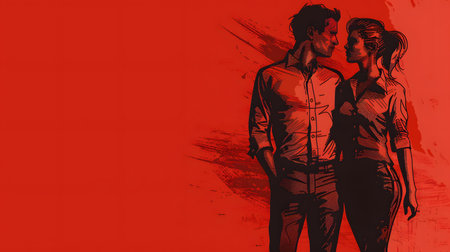 Silhouettes of two individuals stand against a vibrant red backdrop, highlighting a collaborative spirit and creativity in a digital workspace filled with energy and dynamism.