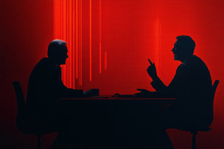 Two silhouettes engaged in a heated discussion, illuminated by striking red light, conveying tension and deep conversation.