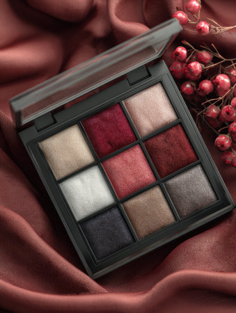 A makeup palette of rich colors rests elegantly on silky fabric, creating an inviting and artistic display with a clean base.