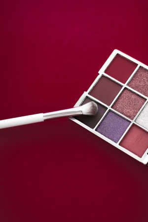 Cosmetic branding, mua and girly concept - Eyeshadow palette and make-up brush on red silk background,