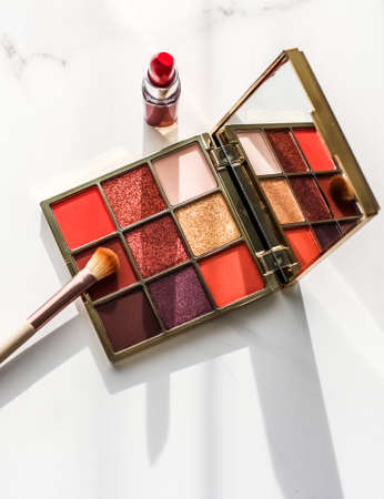 Cosmetic branding, girly and glamour concept - Cosmetics, makeup products set on marble vanity table, lipstick, eyeshadows and make-up brush for luxury beauty and fashion brand ads, holiday design