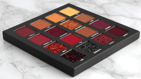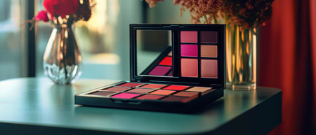 Vibrant eyeshadow palette open on a stylish vanity with soft lighting and rich colors