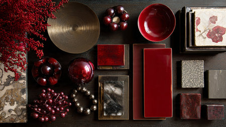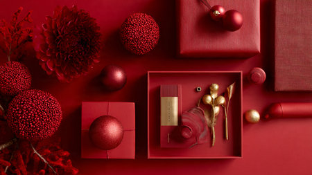 Minimalist design merging deep red surfaces with selective gold holiday accents.