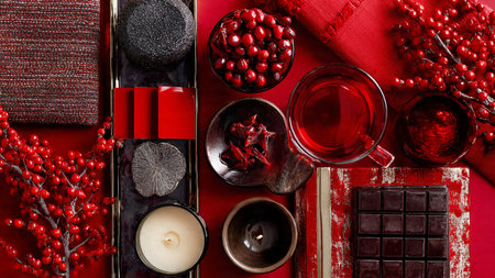 A stunning flat lay showcasing a blend of textiles, wooden bowls, and decorative elements arranged on a vibrant red and neutral background, emphasizing texture and color.