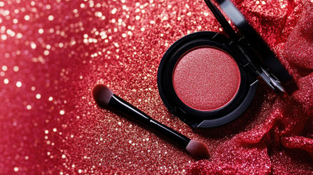 A striking image featuring a red blush compact next to a makeup brush, set against a sparkling backdrop. Perfect for beauty-themed projects and advertisements.