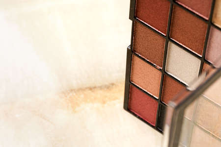 A broken eye shadow make up palette on a beige background. Beauty and cosmetic concept. Flat layout. Copy space.