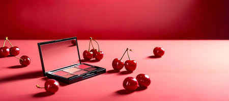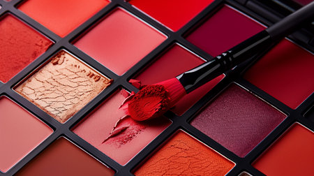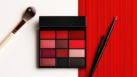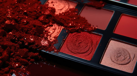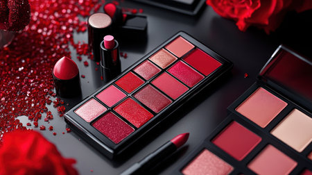 A vibrant collection of red cosmetics, featuring palette and lipsticks, evokes sense of glamour and beauty..